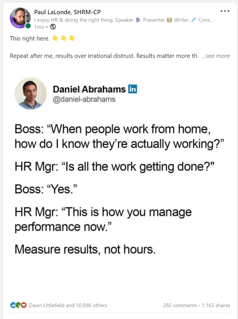“Love this! When did we lose sight of paying employees for results instead of their time?”