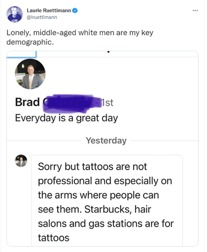 Laurie Ruettimann recently posted an unprovoked message she received from Brad, who disapproved of her tattoos. Apparently, Laurie needed to work in a gas station, and not in HR.