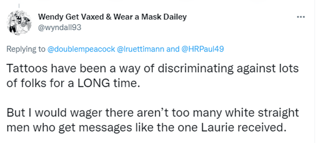 As an admirer of Laurie’s, and fellow tattooed professional, I jumped to her defense. “Tattoos are OK for the workplace, yada yada yada,” was essentially my response. Laurie kindly pointed out that this isn’t about tattoos. It’s about policing women’s bodies, in her words.